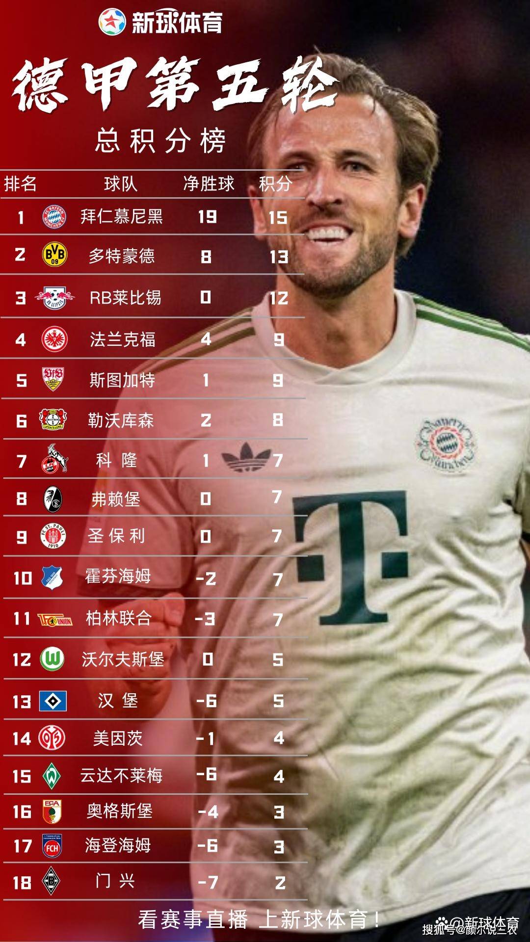 经过五轮激战,拜仁慕尼黑以全胜战绩积15分领跑积分榜。多特蒙德以4胜1平积13分紧随其后,RB莱比锡积12分位列第三。法兰克福本轮获胜后,总积分达到9分,位列第四。
